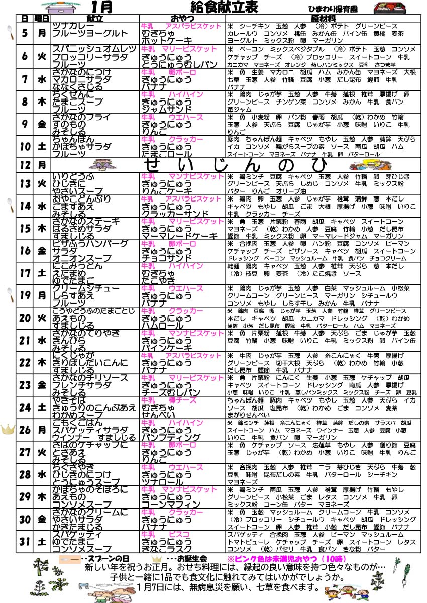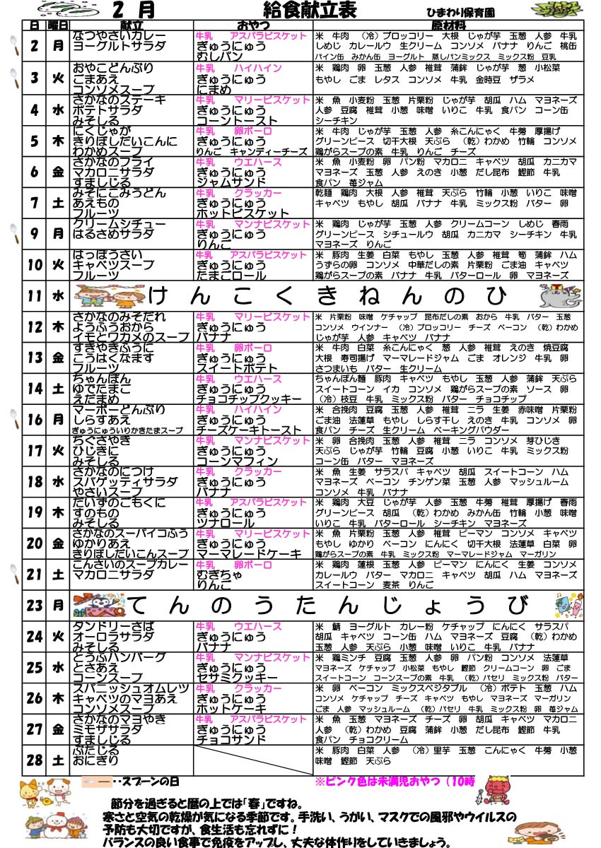 2月の園だより、クラスだより、献立予定を掲載しました。