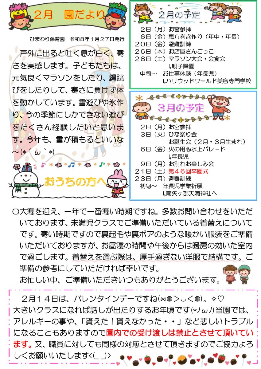 2月の園だより、クラスだより、献立予定を掲載しました。