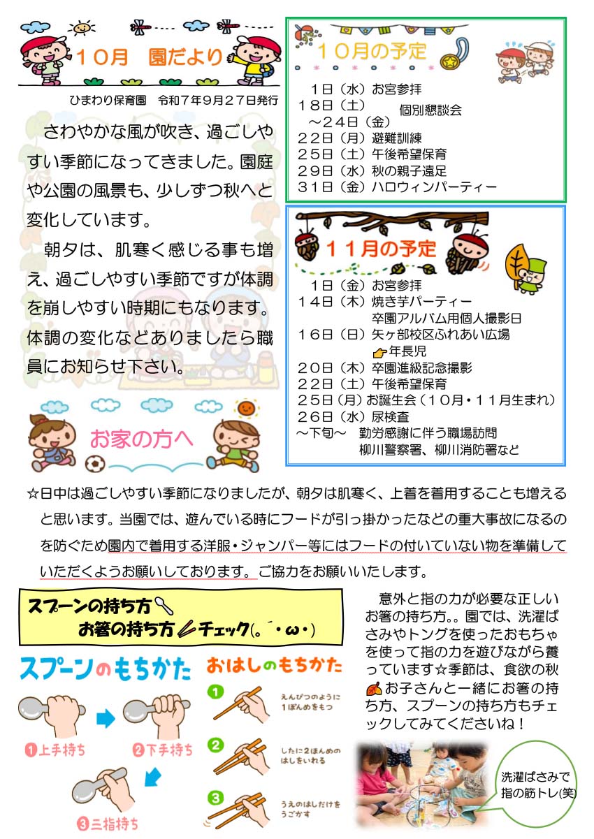 10月の園だより、クラスだより、献立予定を掲載しました。